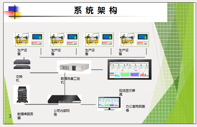 現(xiàn)場顯示:采用大尺寸屏幕,實(shí)時(shí)顯示設(shè)備狀態(tài)和生產(chǎn)狀況,可在辦公室電腦查看。