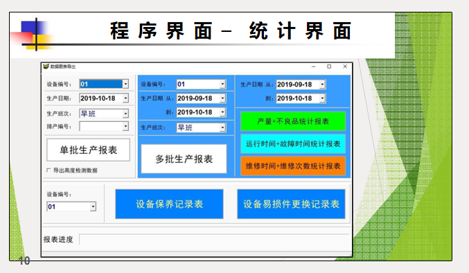 有豐富的統(tǒng)計(jì)功能,對(duì)于產(chǎn)量、不良品按時(shí)間進(jìn)行統(tǒng)計(jì),統(tǒng)計(jì)維修時(shí)間、維修次數(shù)、停 機(jī)時(shí)間、停機(jī)次數(shù)、運(yùn)行時(shí)間,這些龐大的基礎(chǔ)數(shù)據(jù)進(jìn)行歸類,可以為決策者制定生產(chǎn) 和設(shè)備改善計(jì)劃提供強(qiáng)大的數(shù)據(jù)支持。