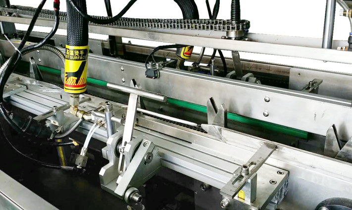 3)當紙盒送到推料口處,將有(上、下、左、右)四處檔板將盒子撐開,讓產品順利推入紙盒內,如出現產品推不進去的情況,機器則會自動停機,起到保護機器及產品的作用。
